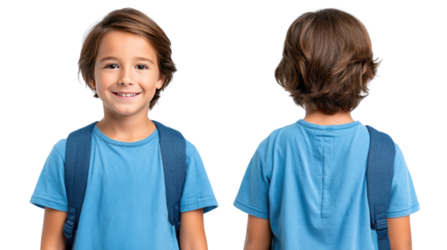 Schoolboy Dual Perspective: Front and back views of a schoolboy in a blue t-shirt and backpack, showcasing his cheerful front and simple back.