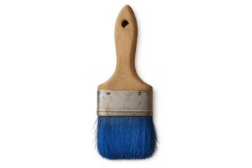 Paintbrush with blue paint, wooden handle, and metal ferrule, art tool for creative projects and diy, transparent background