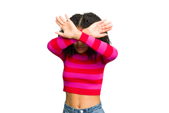 Megaphone, fashion and woman voice for news, broadcast or student sale isolated on transparent png background. African person, gen z or youth with announcement, call to action or clothes promotion
