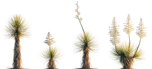 Three yucca plants with white flowers isolated on transparent background