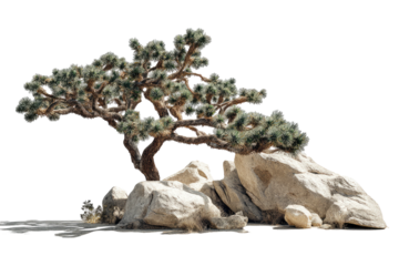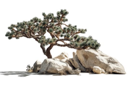 Twisted desert tree on rocks, isolated against black space