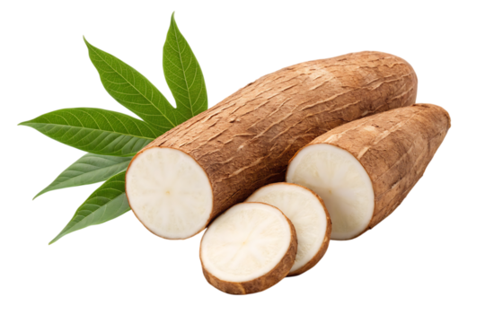 Fresh cassava root with leaves, sliced for cooking and healthy eating