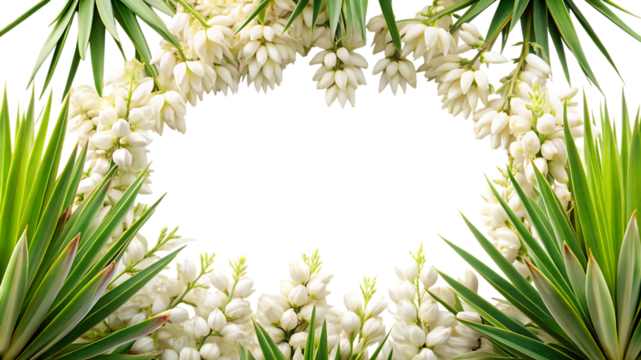 A tall stalk of white yucca flowers with green sword like leaves isolated on transparent background