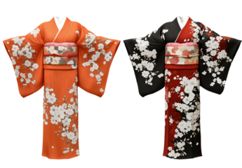 3 different styles of kimono with floral pattern on orange color, isolated white background, png transparent