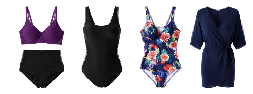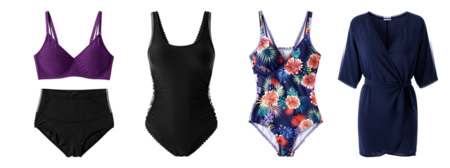 Four pieces of clothing laid out in a row: purple bikini top, black high-waisted bottoms, black one-piece swimsuit, colorful floral one-piece swimsuit, and navy blue wrap dress.