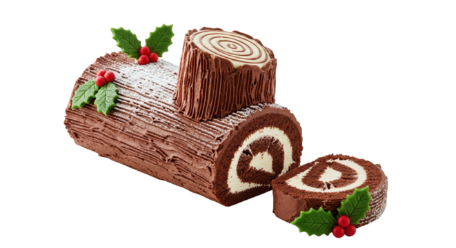 A chocolate yule log cake decorated with holly and a slice cut off, isolated on transparent background