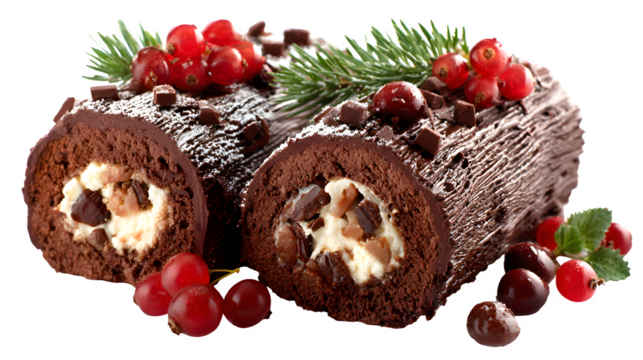 Chocolate Yule Log Cake with Berries and Sugar Dusting on Transparent Background