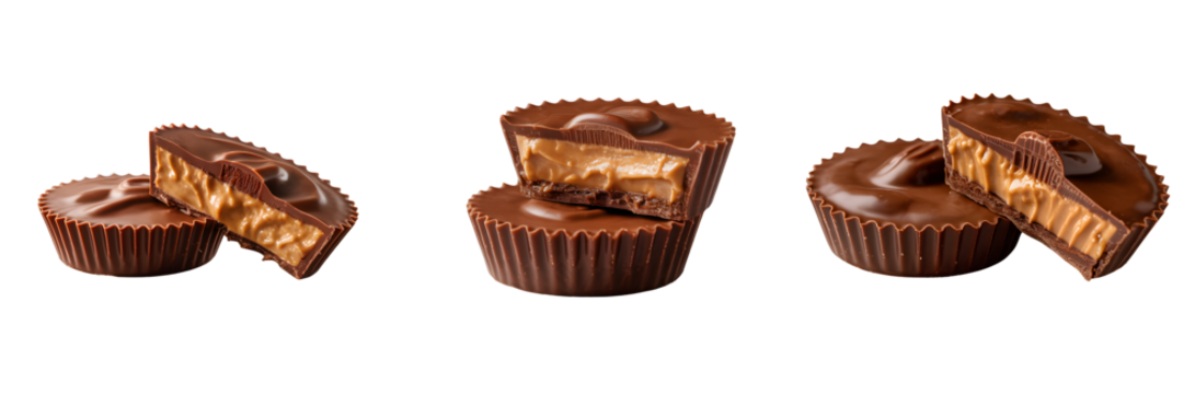 Three chocolate peanut butter cups on transparent background