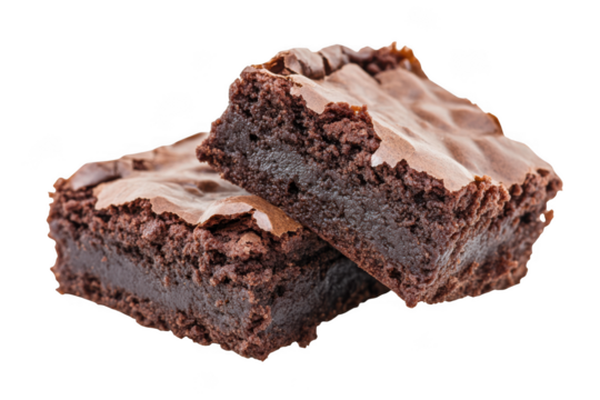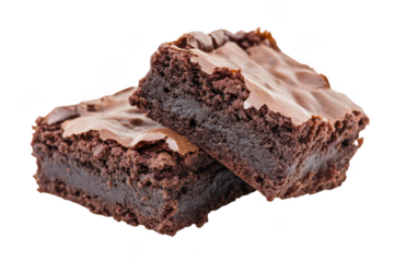 Delicious chocolate brownies with rich chocolate frosting and crumbly edges isolated on transparent background