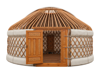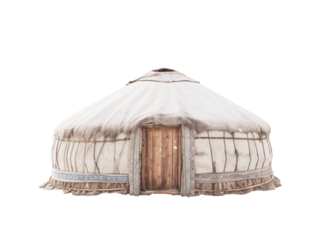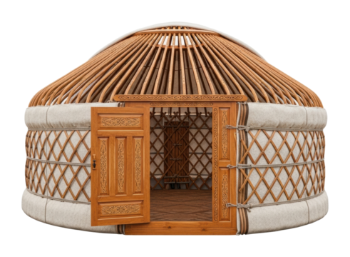 Traditional yurt dwelling with a circular wooden lattice frame isolated with transparent background