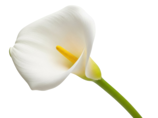 A single beautiful white calla lily flower with a green stem and elegant petal blooms in macro isolation on a white background, showcasing the natural floral beauty of this arum spring blossom