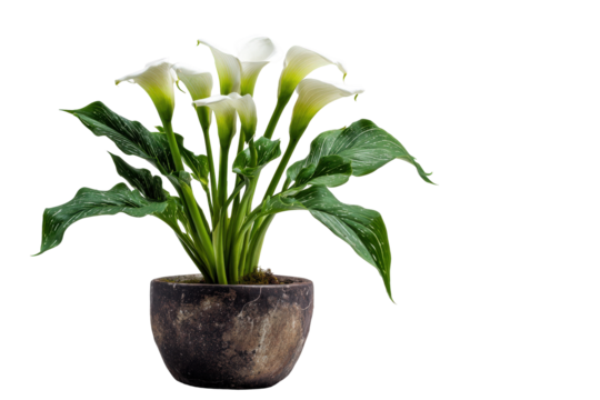 Elegant white calla lily plant with lush green leaves in a rustic pot.
