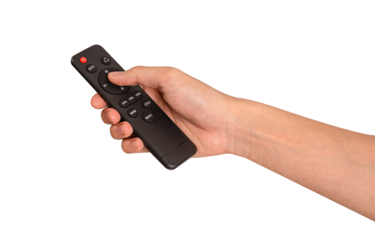 Hand holding remote control isolated on isolated on transparent PNG.