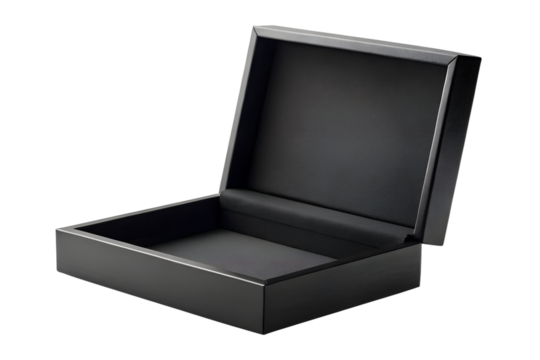 A sleek, open black rectangular box, perfect for storing small items, presented on a clean white background, showcasing its elegant design