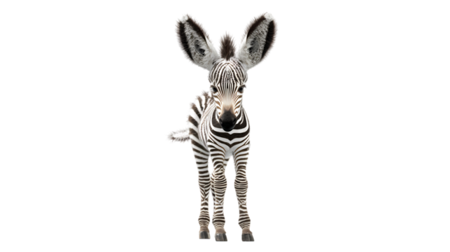 Adorable baby zebra with large ears standing tall on a transparent background isolated on transparent background