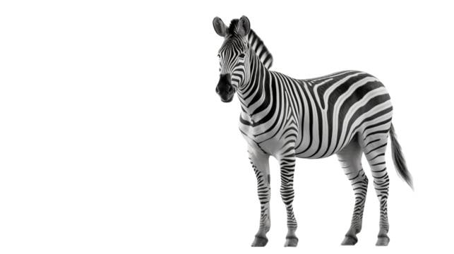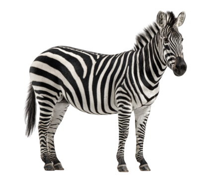 A zebra standing in profile, isolated on transparent background, showcasing its distinctive black and white stripes, a unique african wildlife animal