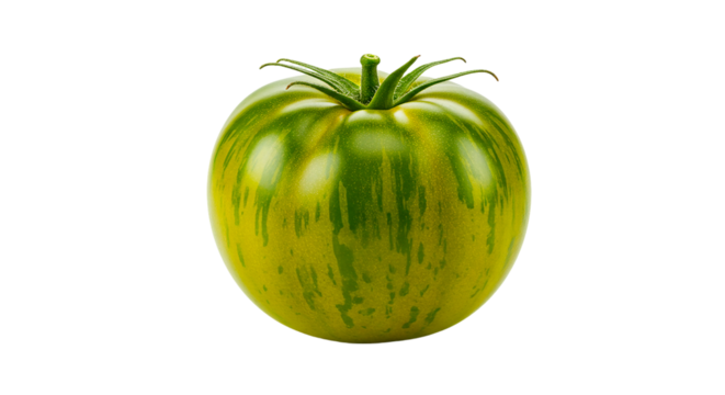 Close up of a green zebra tomato with yellow stripes on a black background in studio lighting