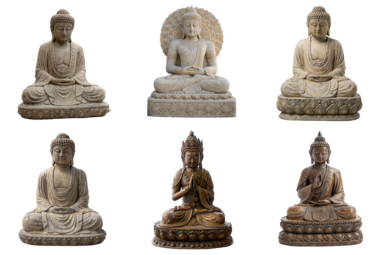 Buddha statue represents peace and tranquility in an isolated setting with a transparent background highlighting its intricate details and serene expression