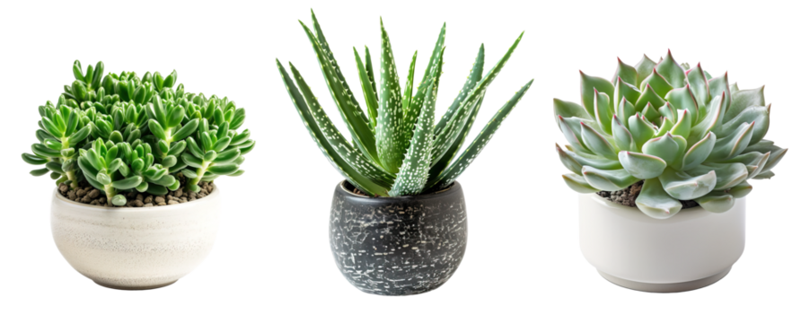 Tiny cute succulent plants collection on ceramic pots over isolated transparent background