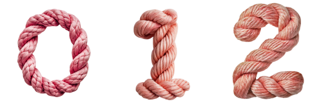 Png of Numbers 0, 1, and 2 crafted from soft pink braided rope with a realistic texture on transparent background.