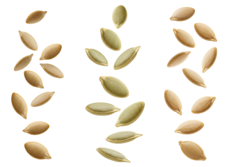 Pumpkin seeds set PNG. Pumpkin seeds falling down isolated. Flat, oval seeds from pumpkins flying PNG. Pumpkin seeds full of magnesium and zinc suspended in air isolated