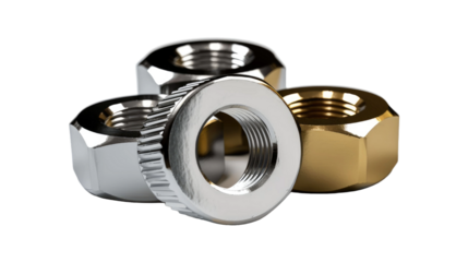 Metal nut and washer sit together on a dark surface, showing their shiny textures and threading.