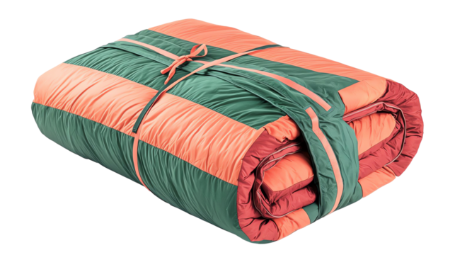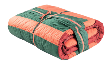 Colorful sleeping bag, folded and tied with a strap.