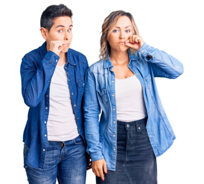 Couple of women wearing casual clothes mouth and lips shut as zip with fingers. secret and silent, taboo talking