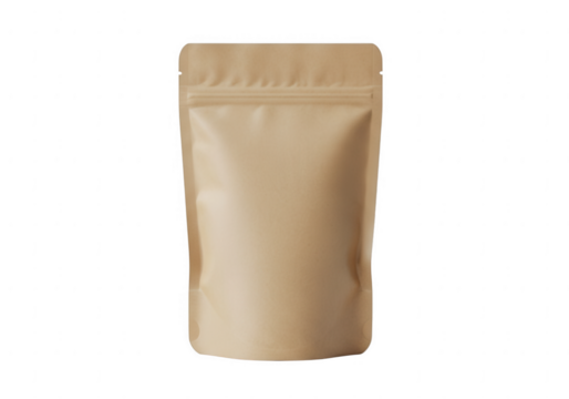 A plain brown paper stand up pouch with a resealable zipper closure isolated on transparent background