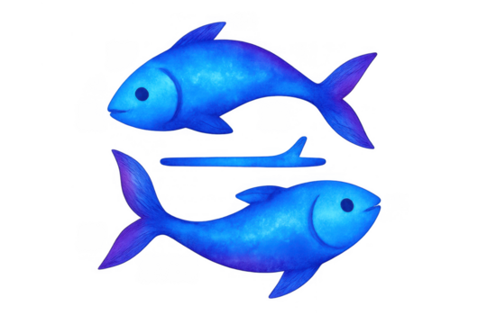Pisces zodiac sign symbol illustrating two blue fish connected by abstract line on transparent background for astrology concept