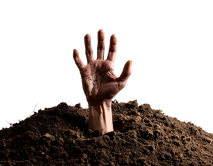An eerie and dramatic image of a mud-covered hand reaching up from a pile of dirt. Smoke or fog can be seen below the ground, creating a mysterious and ominous atmosphere. The image is shot against a