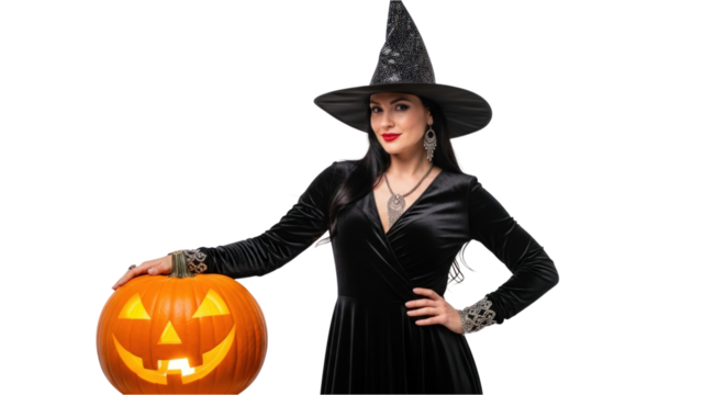 Beautiful woman in a witch costume with a pumpkin isolated on a transparent background for a Halloween party