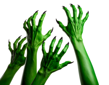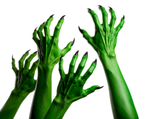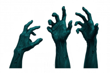 Three decaying zombie hands reach out from a transparent background, creating a chilling halloween or horror scene