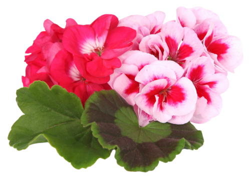 Flowers of Pelargonium hortorum, commonly called zonal geranium or garden geranium. Pink, red and white flowers. Cut out and isolated.