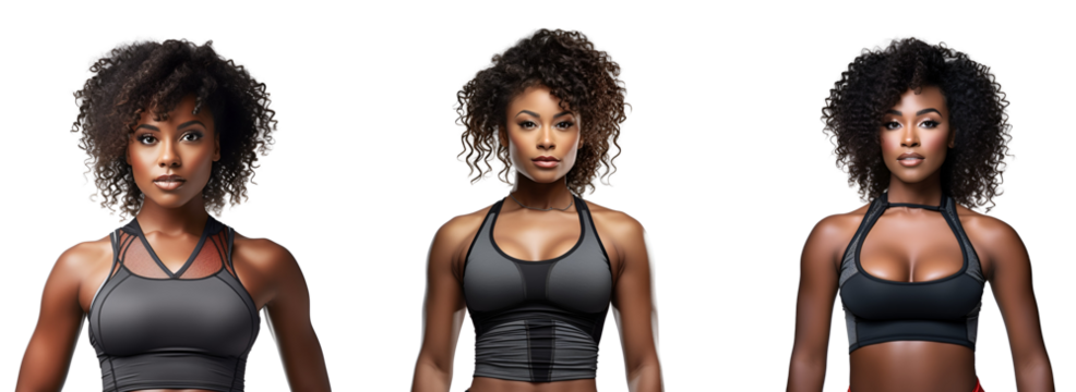 Set of gym outfits on a fitness black woman for display, Isolated on Transparent Background, PNG