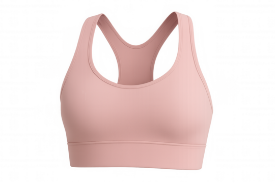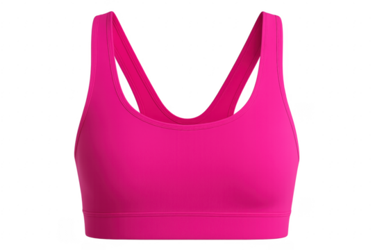 Pink sports bra hanging on transparent background, highlighting athletic wear design and fitness fashion trend