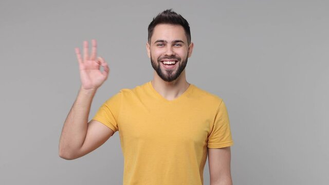 Excited cheerful amazed bearded young man 20s years old wearing yellow casual basic t-shirt isolated on grey color background studio. People lifestyle concept. Looking camera showing ok okay gesture