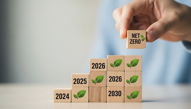 Hand placing a wooden block with net zero text on a rising graph of blocks representing years and sustainability