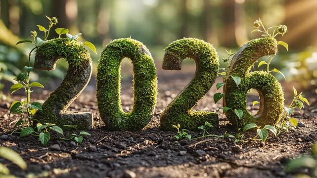 Numbers 2026 made of moss emerging from cracked soil, representing new year growth with green plant sprout.
