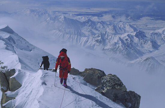 A rope team ascends the exposed West ButtressRoute at 17,000 feet on Denali.