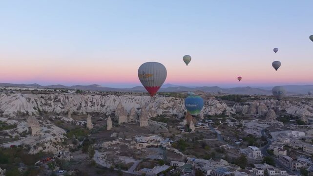 Goreme, Turkey - 01 December 2024: Aerial view of hot air balloons over scenic rock formations at sunrise, Goreme, Turkey.
