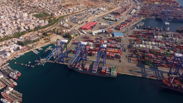 Perama, Greece - 01 December 2024: Aerial view of bustling container port with cranes and stacked cargo containers, Perama, Greece.