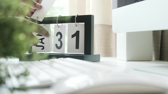 person hand flipping minimal calendar from last day of year Dec 31 to new year Jan 01 on office table