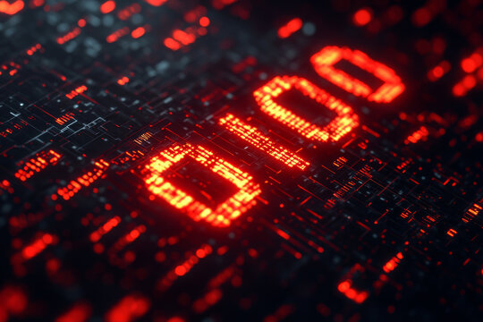 Red glowing digital 0100 numbers on a black background with a binary code and computer chip pattern, close-up view.