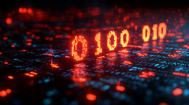 Glowing binary code 0100, digital data stream, futuristic technology background.