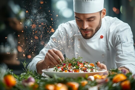 A professional chef seasoning a dish with herbs in 0345 food, salad, smiling, holding, eating, healthy, diet, fruit, smile, person, people, vegetable, vegetables, kitchen, bag, chef, cooking, cook, bo