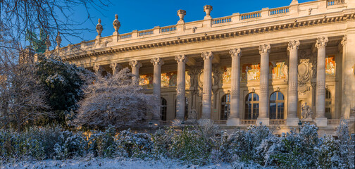Paris, France - 01 06 2026: Snow flakes. Panoramic view of the facade of Le Grand Palais under the snow and blue sky