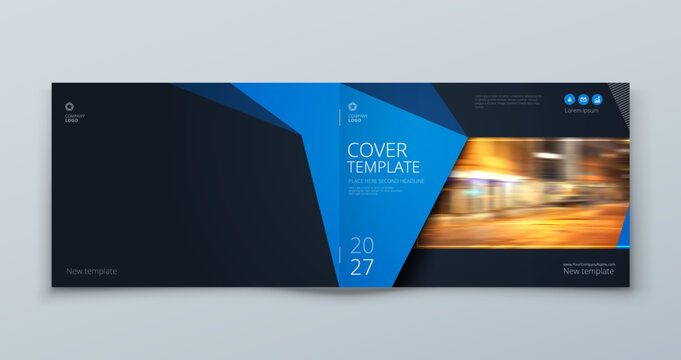 Horizontal Brochure template layout design. Corporate business annual report, catalog, magazine mockup. Layout with modern blue elements and photo. Creative poster, booklet, flyer or banner concept