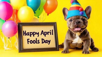 Celebrating April Fools Day with a smiling dog and colorful balloons in a festive setting
