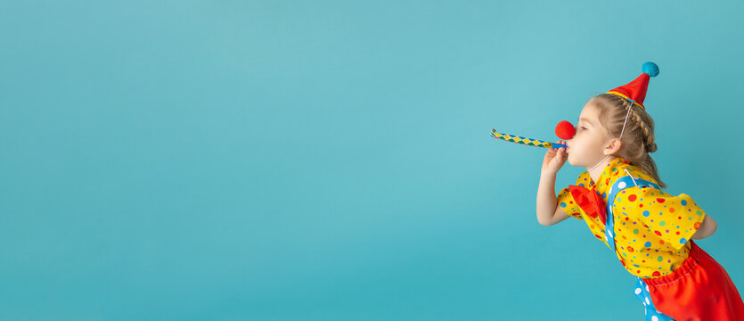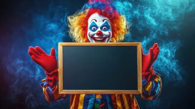 Colorful clown holds blank chalkboard and smiles under vibrant lights at a festive event. April Fools Day concept